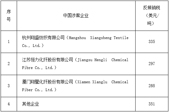 2021年2月3日,土耳其貿(mào)易部發(fā)布第2021/6號(hào)公告,對(duì)原產(chǎn)于中國(guó)、印度尼西亞、馬來西亞、泰國(guó)、越南聚酯紗線作出反傾銷日落復(fù)審肯定性終裁,維持上述國(guó)家涉案產(chǎn)品的反傾銷稅,中國(guó)為268-351美元/噸(詳見下表)、印度尼西亞為48-240美元/噸、馬來西亞為276美元/噸、泰國(guó)為到岸價(jià)(CIF)6.88-37.69%、越南為到岸價(jià)34.81-72.56%。涉案產(chǎn)品的土耳其稅號(hào)為5402.33。公告自發(fā)布之日起生效,有效期為5年。