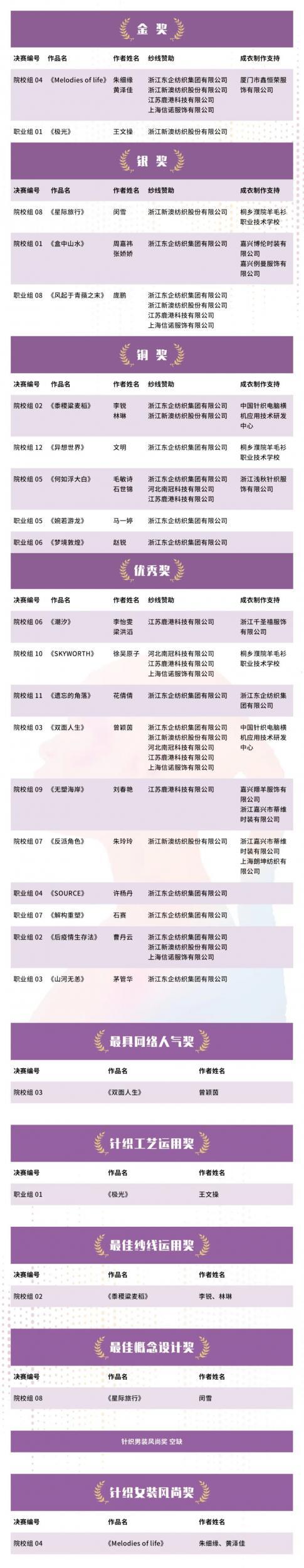 此外,今年大賽組委會還特別設(shè)立了針織工藝運(yùn)用獎、針織男裝風(fēng)尚獎、針織女裝風(fēng)尚獎、佳紗線運(yùn)用獎、佳概念設(shè)計(jì)獎、具網(wǎng)絡(luò)人氣獎等多個單項(xiàng)獎。