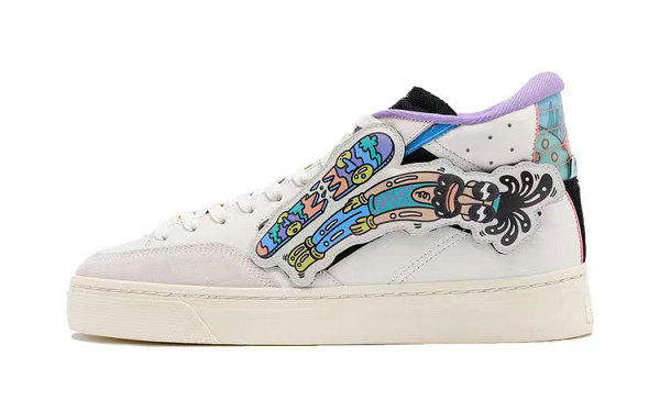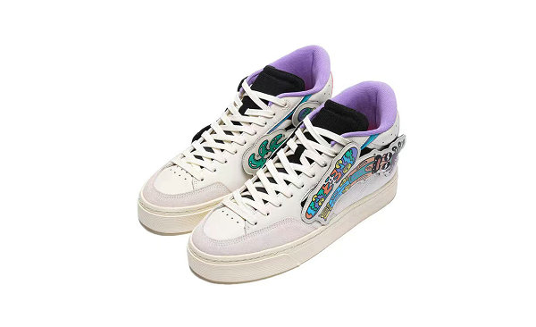 李寧惟吾 180 板鞋進(jìn)行重塑,同時(shí)設(shè)計(jì)了多款魔術(shù)貼徽章供玩家 DIY 造型。鞋跟以手繪圖案搭配閃卡材料一同呈現(xiàn),魔術(shù)貼絨毛鞋舌、多材質(zhì)拼接鞋面以及 DUAL-CUSHION 科技鞋墊、紫色內(nèi)襯等細(xì)節(jié)也設(shè)計(jì)的十分考究。