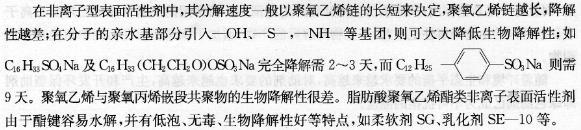 在陰離子型表面活性劑中,其生物降解性大小順序為:線型脂肪皂類>高級脂肪醇硫酸酯>線型醚類硫酸酯(AES)>線型烷基或烯基磺酸鹽(SAS)>線型十二烷基苯磺酸鈉(ABs)>支鏈高級硫酸酯>支鏈類硫酸酯>支鏈十二烷基苯磺酸鈉。
