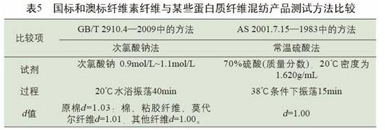 溶液中或多或少地被溶化掉,造成部分情況下測(cè)試結(jié)果失真的情況。而若采納AS(澳大利亞標(biāo)準(zhǔn))2001.7.15—1983的常溫硫酸法,溶化掉的是纖維素纖維,試劑對(duì)羊毛的損耗d值為零,在絕大多數(shù)情況下收效甚好。國(guó)標(biāo)和澳標(biāo)纖維素纖維和某些蛋白質(zhì)纖維混紡化纖織物產(chǎn)品測(cè)試方法比較見表5。
