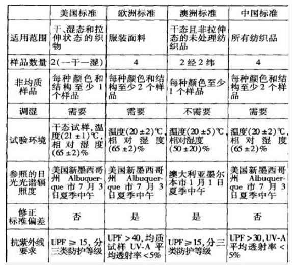 表2 各國(guó)防紫外線測(cè)試方法標(biāo)準(zhǔn)間的差異