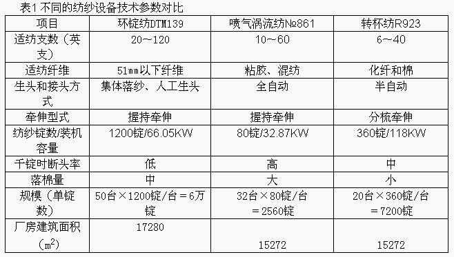 環(huán)錠紡普梳產(chǎn)品的生產(chǎn)工藝流程比噴氣渦流紡和轉(zhuǎn)杯紡要長,多了粗紗和自動絡筒兩個工序。噴氣渦流紡和轉(zhuǎn)杯紡的工藝流程基本相同,因其牽伸型式不一樣。紗的內(nèi)部結(jié)構不同,可紡支數(shù)范圍各有不同,我們在噴氣渦流紡已紡過60S,而轉(zhuǎn)杯紡高紡到40S。噴氣渦流紡雖耗電量比轉(zhuǎn)杯紡和環(huán)錠紡小,但耗氣量、落棉量、回絲量都比轉(zhuǎn)杯紡和環(huán)錠紡消耗要高。不同的紡紗設備技術參數(shù)比較見表1: