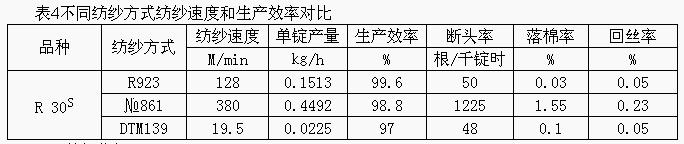 不同的設備有不同的紡紗速度,即使是同一纖維紡同一規(guī)格品種也不一樣,我公司生產(chǎn)的粘膠30S紗,在前紡各工序的原材料、工藝參數(shù)、半成品質(zhì)量都一樣,用不同機型進行生產(chǎn),其紡紗速度和生產(chǎn)效率數(shù)據(jù)見表4: