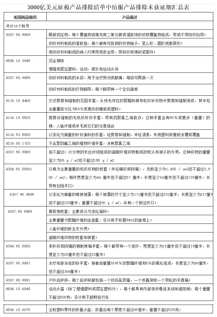 美國當?shù)貢r間2020年當?shù)貢r間8月28日,美國貿易代表辦公室公布3000億美元加征關稅延長排除有效期產品清單。原美國3000億關稅排除產品清單共有214項,本次獲得延長有效期的產品有87項(包含14個完全排除產品),約占原清單的40%,其中包括紡服產品35項;未獲得延長有效期的產品有127項,約占原清單的60%,其中包含紡服產品稅號16個。原定排除有效期至美國東部時間2020年9月1日?,F(xiàn)通知決定將部分產品排除有效期自2020年9月1日起延長至2020年12月31日。