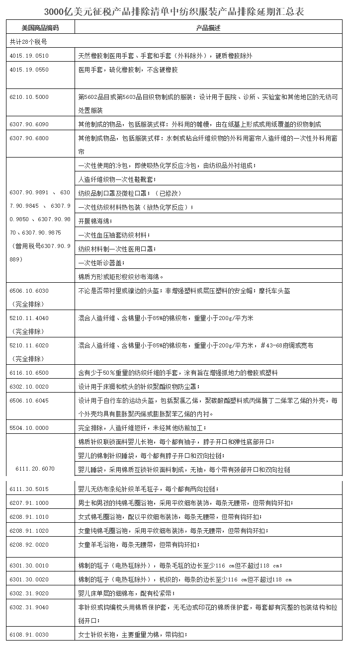本次獲得延期的紡織服裝產品描述與HS碼如下: