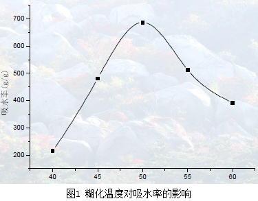 由圖1可知,纖維素的佳糊化溫度為50℃,此時(shí)吸水率大(為687g/g)。這是由于糊化溫度低時(shí),纖維素的活化效果不佳,接枝共聚反應(yīng)不易發(fā)生,聚合物分子量小,故吸水率較低。而糊化溫度過(guò)高,纖維素結(jié)構(gòu)會(huì)遭到破壞,吸水率降低。