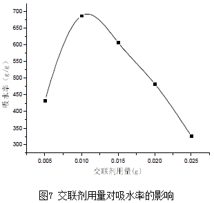 由圖7可以看出交聯(lián)劑的佳用量為0.01g,此時(shí)吸水率大。這是因?yàn)闃?shù)脂是三維站體網(wǎng)絡(luò)結(jié)構(gòu),當(dāng)交聯(lián)劑用量太少時(shí),聚合物未能形成網(wǎng)絡(luò)結(jié)構(gòu),宏觀上表現(xiàn)為水溶性。隨著交聯(lián)劑用量的增加,分子鏈網(wǎng)絡(luò)逐漸形成,故吸水率逐漸上升。形成三維網(wǎng)絡(luò)結(jié)構(gòu)時(shí),吸水率達(dá)到大值。隨著交聯(lián)劑用量的進(jìn)一步增加,聚合物網(wǎng)絡(luò)結(jié)構(gòu)中的交聯(lián)點(diǎn)增多,交聯(lián)點(diǎn)之間的網(wǎng)鏈變短,網(wǎng)絡(luò)結(jié)構(gòu)中的微孔變小。故吸水率逐漸下降。