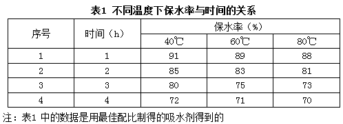由表1可以看出,纖維素接枝丙烯酸類高吸水性樹(shù)脂的保水性較好,即使在80℃經(jīng)4h仍能保持70%的水分。同一時(shí)間里,40℃、60℃、80℃的保水率