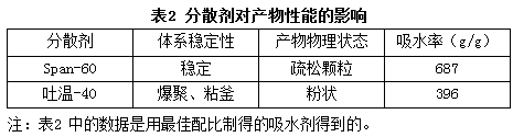 Span-60作為分散劑,它的用量主要影響分散效果的好壞,進(jìn)而影響產(chǎn)品的外形及散熱情況等,固定其他反應(yīng)條件不變,考察分散劑對(duì)產(chǎn)品吸水率的影響。