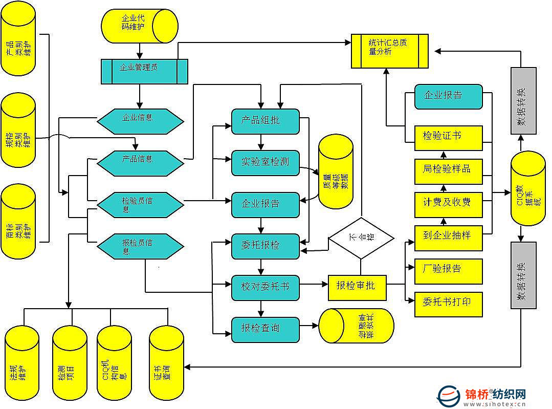 出口桑蠶絲質(zhì)量監(jiān)管流程設計基本邏輯是:步,建站桑蠶絲出口企業(yè)信息、絲類產(chǎn)品類別、產(chǎn)品規(guī)格類別、產(chǎn)品商標類別、產(chǎn)品質(zhì)量等級等質(zhì)量監(jiān)管流程數(shù)據(jù)庫;第二步,由檢驗檢疫機構(gòu)編輯絲類產(chǎn)品類別信息、產(chǎn)品規(guī)格類別信息、產(chǎn)品商標類別信息、產(chǎn)品質(zhì)量等級信息及企業(yè)代碼信息;第三步,由企業(yè)治理員編輯本企業(yè)信息、產(chǎn)品信息、分配用戶權限;第四步,由企業(yè)檢驗員對企業(yè)產(chǎn)品進行操作:①參照檢測標準對產(chǎn)品組批,②錄入或采集企業(yè)實驗室檢驗數(shù)據(jù)或日常廠檢數(shù)據(jù),③查瞧企業(yè)檢測報告,④系統(tǒng)根據(jù)企業(yè)信息和產(chǎn)品信息生成企業(yè)和檢驗檢疫機構(gòu)的托付檢驗協(xié)議;第五步,由企業(yè)報檢員對檢驗員的已組批產(chǎn)品報檢:①托付報檢,②校對托付協(xié)議書;第六步,由檢驗檢疫機構(gòu)對報檢信息進行審批:①審批合格,檢驗檢疫機構(gòu)進行下廠扦樣打算工作;②審批不合格,返歸企業(yè)修改報檢信息。