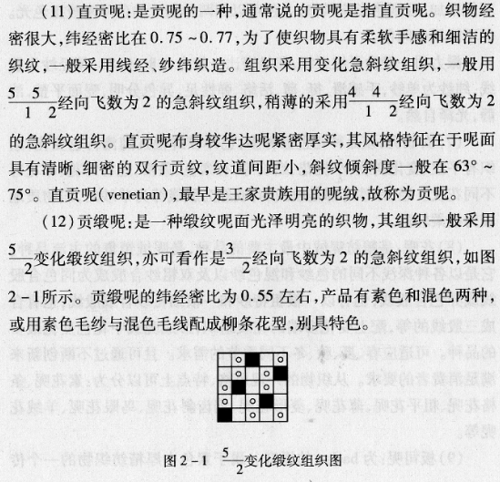 (9)板司呢:為basket的譯音。屬于素色中厚精面料物的一個傳  統(tǒng)品種。組織常用2/2方平,緯經(jīng)密比在0.85~0.88,品種有純色和混色兩種,常用A/B花線(兩種顏色不同的紗合股加捻的花色線),呢面呈現(xiàn)小方塊的風(fēng)格特征,身骨較緊密厚實。
