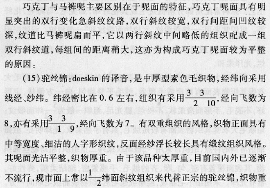 (2)華達呢:又名軋別丁(gabardine),由于華達呢常采納阻水后整理,用作晴雨大衣呢布料,所以都是譯名。過去商業(yè)上習(xí)慣以線經(jīng)、紗緯的稱為華達呢,線經(jīng)、線緯的稱為軋別丁。組織一般為2/2右斜,斜紋是角度為62°-63°的急斜紋。呢面上具有清楚凸起的以經(jīng)紗為主體的粗條紋的斜紋貢子。其緯經(jīng)比在0.50~0.52左右。華達呢有中厚型、中薄型及厚重型三種規(guī)格。中厚型華達呢,簡稱華達呢,要求呢面紋路粗而直,經(jīng)緯紗結(jié)構(gòu)緊密,身骨厚實,是華達呢品類中的代表品種。中薄型華達呢,又稱單面華達呢,組織為2/1右斜,呢面呈現(xiàn)細密清楚的急斜紋,身骨堅實、細沽,由于是2/1右斜組織,織物反面為不明顯的緯面斜紋,這是單面華達呢的由來。產(chǎn)品重量較輕,織物細潔雅致,懸垂性好。厚重型華達呢又稱緞背華達呢,組織為緞背組織(加強緞紋的一種),織物正面近似2/急斜紋,反面為經(jīng)緞紋組織,類似雙層組織。其斜紋傾斜角為56°一57°,緯經(jīng)密比為0.45-0.50,織物身骨飽滿,保暖性好。