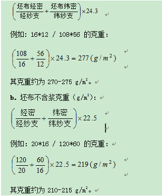 參照以上同類別成品每平方米重量計算公式.如果經(jīng)緯向是線,由于捻縮的原因,成品每平方米重量偏重,大約增重1%。氣流紡紗因為配棉較差,短纖維較多,通過印染退漿、絲完工序纖維損失率較大,所以紗系數(shù)用24或24.3*0.95,此系數(shù)為經(jīng)驗公式,對于32S以上的紗線支數(shù)較為精確。本色棉布每平方米重量計算