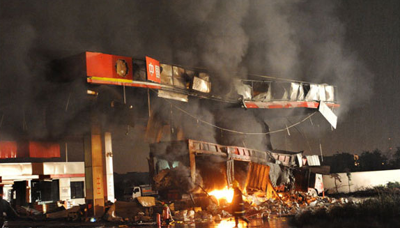 1987年11月30日,燕山石化公司煉油廠裝油臺(tái)在給河北省三河縣土莊鄉(xiāng)加油站東風(fēng)140型汽車槽車裝0號(hào)柴油時(shí),槽車突然發(fā)生爆炸著火。爆炸氣浪將在槽車頂部看油位的司機(jī)掀落在地上,臉部和手被燒傷,6站方米的儲(chǔ)油罐因爆炸變形,并有七處破裂報(bào)廢。