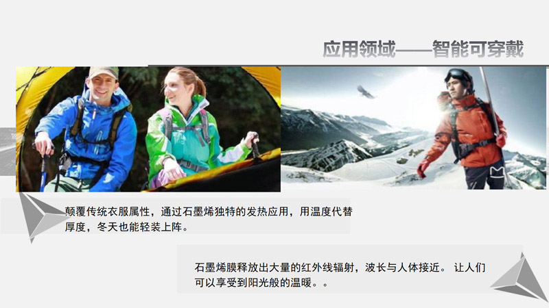 2.石墨烯內(nèi)暖纖維長(zhǎng)絲、短纖規(guī)格齊全,短纖可與棉毛絲麻等天然纖維以及滌綸腈綸等其他各種纖維等其他各種纖維搭配混紡,長(zhǎng)絲可與各種纖維交織,制備不同功能需求的紗線面料。在紡織領(lǐng)域,可以制成內(nèi)衣、內(nèi)褲、襪類(lèi)、嬰幼服飾、家居面料、戶外服裝等。石墨烯內(nèi)暖纖維的用途并不僅限于服裝領(lǐng)域,還可以應(yīng)用于車(chē)輛內(nèi)飾、美容醫(yī)療衛(wèi)材、摩擦材料、過(guò)濾材料等。