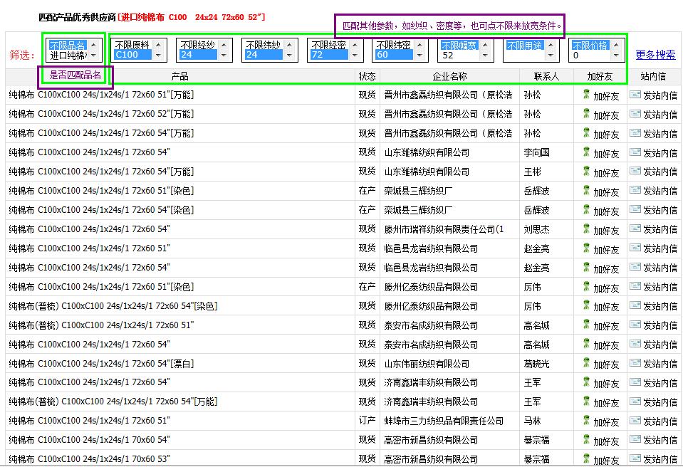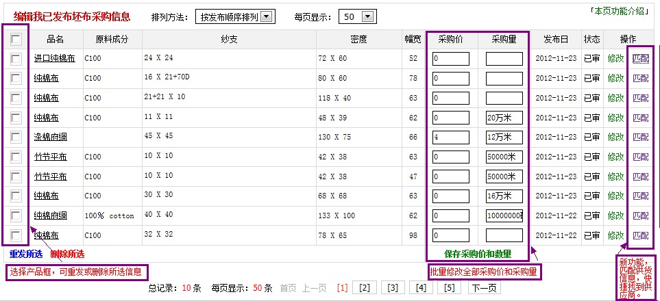 類(lèi)似坯布供貨的編輯,采購(gòu)的功能很多都與供貨是一樣,可以點(diǎn)擊多選框來(lái)重新發(fā)布或者刪除采購(gòu)信息,可以通過(guò)頁(yè)面中的文本框直接修改采購(gòu)價(jià)和采購(gòu)量(點(diǎn)“保存采購(gòu)價(jià)和數(shù)量”來(lái)提交保存修改),然后就是可以根據(jù)您發(fā)布的采購(gòu)規(guī)格在本網(wǎng)“匹配”供貨信息快捷找到可靠的供應(yīng)商。“匹配”供應(yīng)商的功能見(jiàn)下圖: