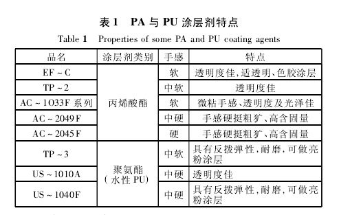 聚丙烯酸酯類(PA)和聚氨酯類(PU)涂層劑是目前常用的涂層劑。PA涂層劑具有黏著力強(qiáng),不易泛黃,透明度高,共容性好和成本較低等優(yōu)點(diǎn),可生產(chǎn)有色涂層產(chǎn)品。其產(chǎn)品耐日光、耐氣候牢度和耐洗性好,但存在織物彈性差、易折皺,表面光潔度差,手感欠佳等缺點(diǎn)。PU涂層劑具有柔軟、彈性好、涂層強(qiáng)度高、耐磨、耐濕、耐低溫和耐干洗等特點(diǎn)。如果在涂層上進(jìn)行微孔加工,織物還能兼?zhèn)浞里L(fēng)、防水和防污性能,且透濕和透氣性好,但其成本較高,耐氣候性差,遇水、熱、堿會(huì)發(fā)生水解等問題。表1列出了PA和PU涂層的主要特點(diǎn)。