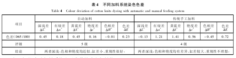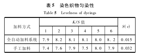 表4表明,自動(dòng)加料系統(tǒng)由于稱量精確和加料均勻穩(wěn)定,減少了人工稱量誤差,由此避免了由人為操作引起的缸差,使織物具有較高的符樣率,染色重現(xiàn)性比傳統(tǒng)后工加料好,提高了染色一次成功率和產(chǎn)品質(zhì)量。