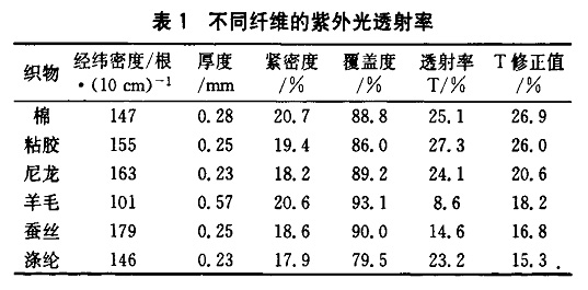 選擇未經(jīng)染色處理并且工藝參數(shù)接近的棉、毛、絲、滌綸和粘膠等機織物進行紫外光透射率的測試,結果見表1。從表1可見,不同纖維織物對紫外光透射率的影響很大,毛織物的紫外光透射率低(8.6%),粘膠織物高(27.3%)。需要注意的是,測試中毛織物的厚度幾乎是其他織物的2倍,因為與其他樣布相同厚度的羊毛織物未找到。因此,在進行比較分析時,需對紫外光透射率的平均值用厚度和覆蓋度進行修正,經(jīng)修正后的紫外光透射率平均值中,較低的是絲織物和滌綸織物(16.8%和15.3%),而棉織物和粘膠織物的紫外光透射率較高(26.9%和26.O%)。