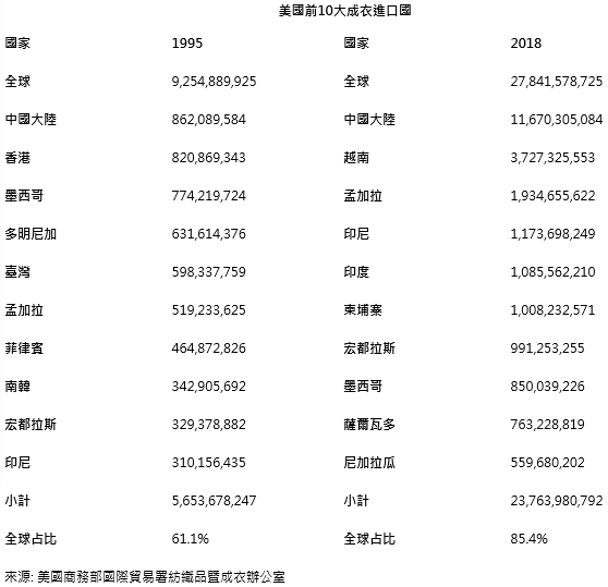 透過美國進(jìn)口統(tǒng)計數(shù)據(jù),我們可以清楚地看到此一現(xiàn)象。WTO于1995年成立以來,美國10大成衣進(jìn)口國占全球輸往美國成衣進(jìn)口總額的61.1%。2018年此一數(shù)字已躍升至85.4%。許多曾被列為十大供應(yīng)國都發(fā)生變化:
