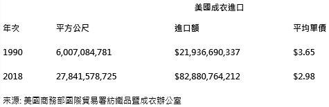 此外多年來這些產(chǎn)品單價已大幅下降,據(jù)美國商務(wù)部國際貿(mào)易署紡織品暨成衣辦公室(OTEXA)數(shù)據(jù),美國進(jìn)口服裝總體平均價格從1990年的每平方米3.67美元下降到2018年的2.98美元。