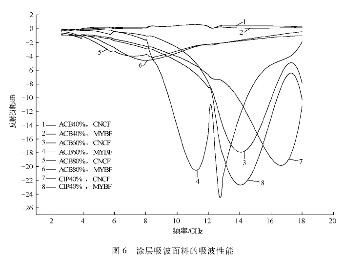 2. 3. 2 基布對涂層面料吸波性能的影響分析圖 6 可知,銅鎳鍍層基布和金屬紗線混紡布吸波涂層面料的吸波曲線的趨勢基本一致。與銅鎳鍍層基布( CNCF) 相比,金屬紗線混紡布( MYBF)涂層面料反射損耗小于 - 6 dB 的頻段更寬,反射損耗小峰值點更低,反射損耗曲線向低頻方向移動了 3 GHz 左右。這 2 種導電基布的屏蔽性能存在一定的差異,金屬紗線混紡基布是將不銹鋼纖維抽成細絲,在布料內(nèi)部形成網(wǎng)格結(jié)構(gòu)。這種不銹鋼纖維網(wǎng)可屏蔽電磁波,當不銹鋼網(wǎng)格孔徑小于電磁波波長四分之一時,就能有效屏蔽電磁波,其屏蔽效能與金屬絲直徑、間距及單位長度的電阻有關(guān)。銅鎳鍍層基布是在紡織品上采用真空蒸發(fā)或磁控濺射的方式鍍膜后,