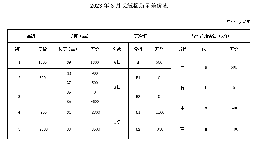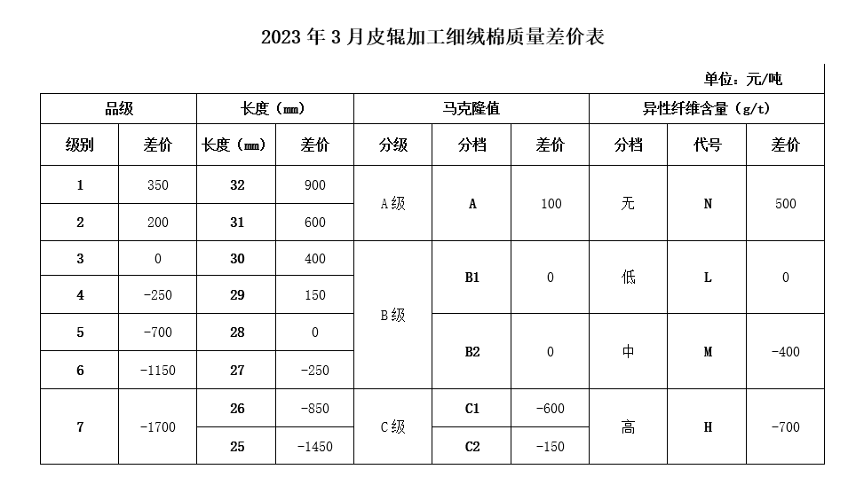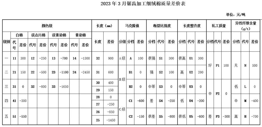 根據(jù)《中國棉花協(xié)會國產(chǎn)棉質(zhì)量差價表管理辦法》規(guī)定,現(xiàn)正式發(fā)布2023年3月《鋸齒加工細(xì)絨棉質(zhì)量差價表》、《皮輥加工細(xì)絨棉質(zhì)量差價表》和《長絨棉質(zhì)量差價表》(單位:元/噸)。