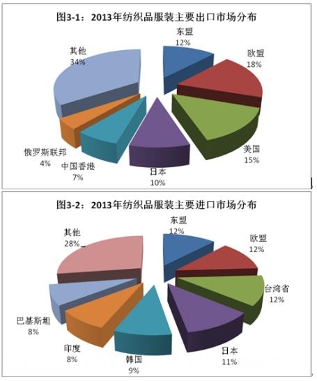 隨著紡織半成品自給化程度的逐步提升,紡織品在進(jìn)口中所占比重逐年縮減。2013年,紡織品進(jìn)口216.7億美元,占進(jìn)口總額的80.3%,占比較2012年下降1.2個(gè)百分點(diǎn)。紡織品進(jìn)口增長(zhǎng)8.7%,其中主要是由紗線增長(zhǎng)25.4%帶動(dòng),制成品僅增長(zhǎng)3.5%,而面料下降4.1%。隨著國(guó)內(nèi)勞動(dòng)力成本的不斷提升,服裝進(jìn)口的比重逐年遞增。2013年,服裝累計(jì)進(jìn)口53.2億美元,占進(jìn)口總額的19.7%,其中以針織、梭織服裝為主。服裝進(jìn)口增長(zhǎng)17.7%,其中針織、梭織服裝合計(jì)增長(zhǎng)21.4%,進(jìn)口平均單價(jià)下降4.8%。