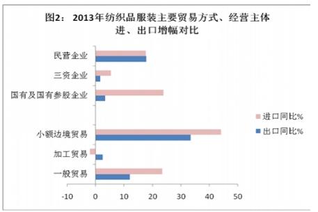 據(jù)中國(guó)海關(guān)統(tǒng)計(jì),2013年,我國(guó)紡織品服裝累計(jì)貿(mào)易額3110.6億美元,增長(zhǎng)11.3%,其中,出口2840.7億美元,增長(zhǎng)11.4%,超過(guò)年初預(yù)期;進(jìn)口269.9億美元,增長(zhǎng)10.4%,累計(jì)順差2570.8億美元,增長(zhǎng)11.5%。紡織品服裝在全國(guó)外貿(mào)中所占比重較上年略有回升,貿(mào)易額占比7.5%,其中出口占12.9%,進(jìn)口占1.4%。紡織品服裝進(jìn)、出口增長(zhǎng)幅度超過(guò)全國(guó)貨物貿(mào)易的增幅,對(duì)全國(guó)貨物貿(mào)易出口增長(zhǎng)的貢獻(xiàn)率達(dá)18%?! ?/p>