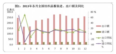 2012年,我國(guó)紡織品服裝出口在內(nèi)外不利因素的影響下再次遭遇“寒流”,全年出口僅增長(zhǎng)2.8%,成為10年中出口增長(zhǎng)緩慢的一年。進(jìn)入2013年,紡織品服裝出口依然要面對(duì)2012年延續(xù)的不利局面:勞動(dòng)力成本上升、內(nèi)外棉價(jià)差高企、人民幣匯率連創(chuàng)新高、訂單轉(zhuǎn)移等,都對(duì)2013年的紡織品服裝出口形成嚴(yán)峻挑戰(zhàn)。但困難中也蘊(yùn)含機(jī)遇:主要經(jīng)濟(jì)體的經(jīng)濟(jì)緩慢復(fù)蘇,外需小幅回升、國(guó)內(nèi)實(shí)施穩(wěn)定外貿(mào)增長(zhǎng)政策的措施成效持續(xù)顯現(xiàn),出口企業(yè)努力轉(zhuǎn)型,頂住出口壓力,逐步企穩(wěn)并保持較快增長(zhǎng)。從全年各月的走勢(shì)看,出口從二季度開(kāi)始步入平穩(wěn)、較快的增長(zhǎng)階段,二至四季度的平均增幅分別為9.2%、11.8%和9.9%。全年共有10個(gè)月的單月出口額超過(guò)200億美元。