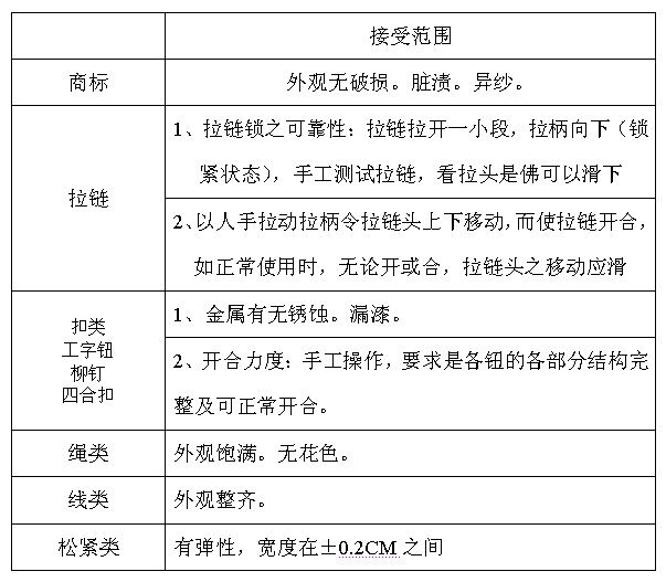2、輔料檢驗內(nèi)容及接受范圍如下: