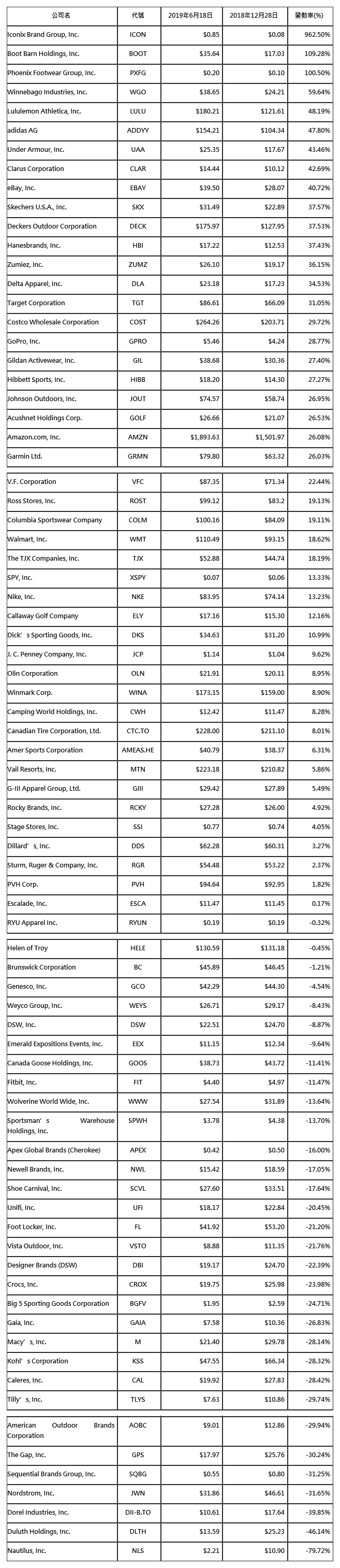 Lululemon于2019年6月公布第1季集團盈利再次超越美國華爾街目標,展現(xiàn)14.4%成長,該公司股價除在2018年上漲54.7%外,在2019年上半年也超前48.2%。UnderArmour的品牌業(yè)務(wù)表現(xiàn)持穩(wěn),2018年回復(fù)22.5%后,在2019年上半年上漲43.5%。由于擔心成長放緩,adidas在2018年僅上漲6%,2019年上半年股價翻轉(zhuǎn)上漲47.8%。ClarustCorp.上漲42.7%,DeckersBrands上漲37.5%,其他行業(yè)股票在2018年都呈上漲趨勢。