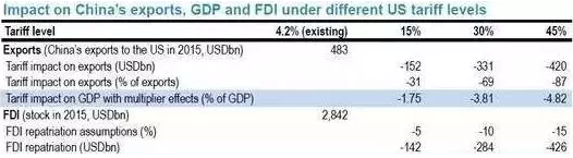 日本大和資本市場公司駐香港的首席經(jīng)濟(jì)學(xué)家賴志文(Kevin Lai)稱,特朗普當(dāng)選后可能將美國對中國的貿(mào)易關(guān)稅由目前的4.2%上升至45%,將令中國對美國的出口下跌4,200億美元或87%。而這個(gè)還沒有把外商撤資計(jì)算在內(nèi)。他估量,在45%關(guān)稅情境下,預(yù)期出口制造業(yè)會由中國移向美國或其他國家,使外資直接投資(FDI)出現(xiàn)撤資規(guī)模達(dá)到4260億美元(GDP3.91%)。而即便是15%的低配版關(guān)稅,也將令中國損失1.8%GDP。