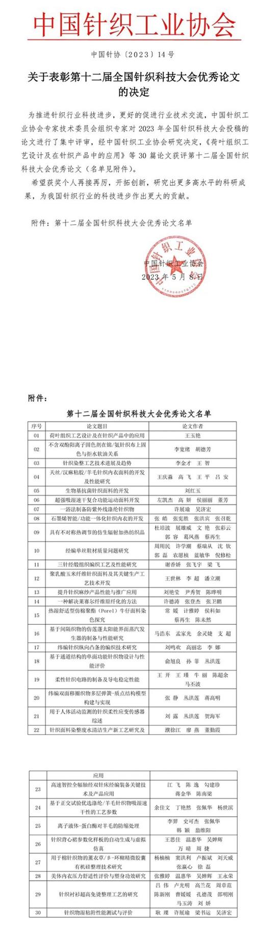 近日,中國(guó)針織工業(yè)協(xié)會(huì)發(fā)布了“關(guān)于表彰第十二屆全國(guó)針織科技大會(huì)優(yōu)秀論文的決定”。決定提到,《荷葉組織工藝設(shè)計(jì)及在針織產(chǎn)品中的應(yīng)用》等30篇論文獲評(píng)第十二屆全國(guó)針織科技大會(huì)優(yōu)秀論文。