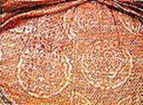 詳細介紹:清代乾隆年間的一種起絨絲,棉交錯物,中國新疆回族傳統(tǒng)織物,綠色長條花紋瑪什魯布絨被的起絨方法和漳絨相仿,屬起毛桿經(jīng)起絨類型,采納扎經(jīng)印染工藝又具有新疆維吾爾族的和田綢特點。經(jīng)線采納家蠶絲,緯線為棉花紗線,經(jīng)密為54根/cm,緯密為24根/cm,經(jīng)線扎染成藍,白,綠,紅,黃五色,并由于纖維毛細管的作用,彩條間帶有別致的無級層次色暈。