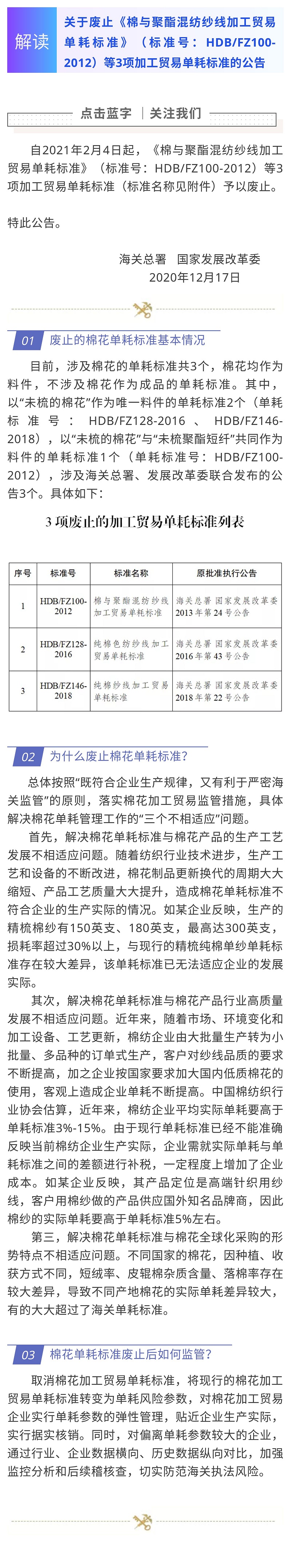解讀關于廢止項紗線加工貿易單耗標準的公告