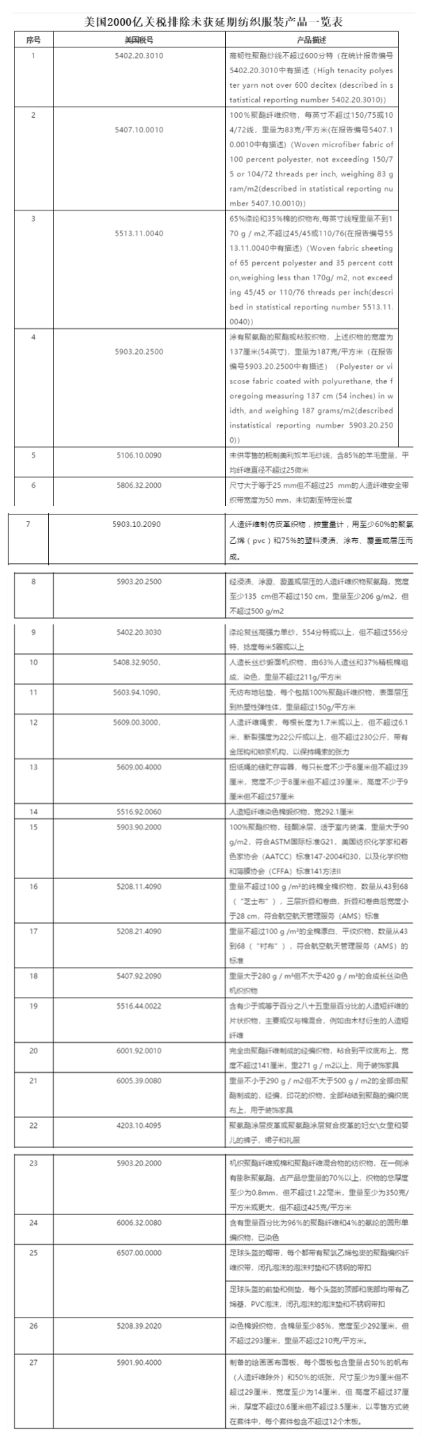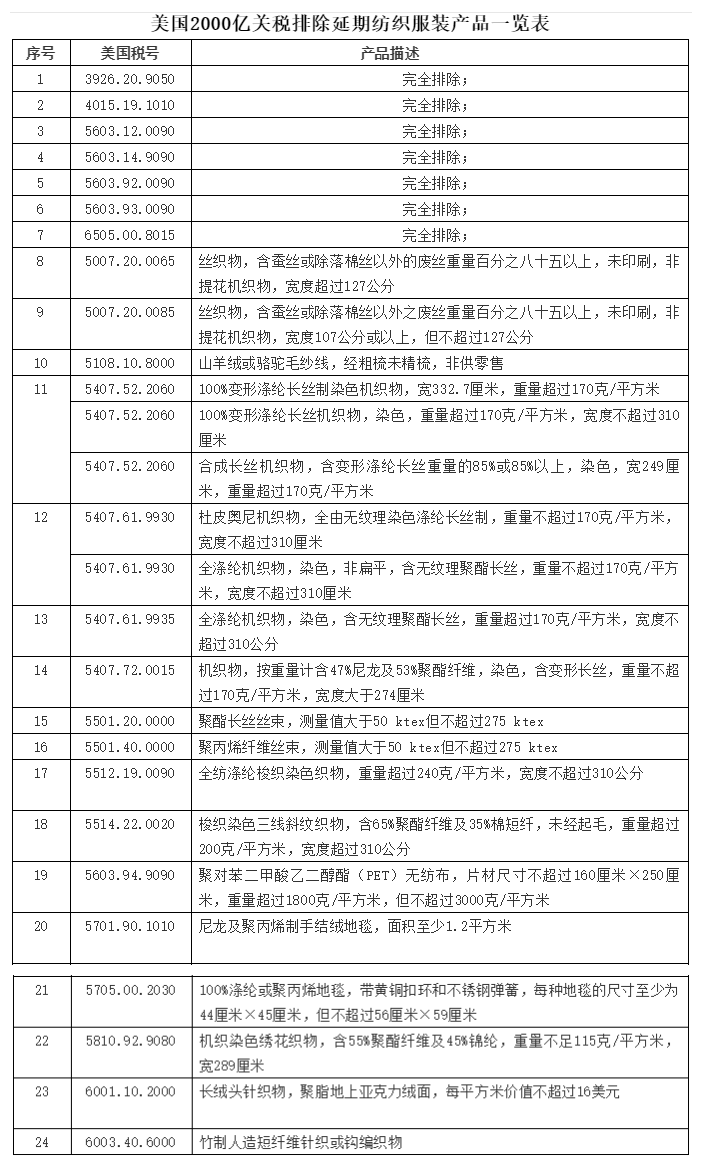 美東時(shí)間2020年8月6日,原美國(guó)2000億關(guān)稅排除產(chǎn)品清單共有997項(xiàng),獲得延長(zhǎng)有效期的產(chǎn)品有266項(xiàng)(包含21個(gè)完全排除產(chǎn)品),約占原清單的1/4,其中包括紡織服裝產(chǎn)品稅號(hào)24個(gè),排除有效期將自2020年8月7日起延長(zhǎng)至2020年12月31日;未獲得延長(zhǎng)有效期的產(chǎn)品有731項(xiàng),約占原清單的3/4,其中包括紡織服裝產(chǎn)品稅號(hào)27個(gè),這些產(chǎn)品將于美國(guó)東部時(shí)間2020年8月7日起恢復(fù)加征25%關(guān)稅。