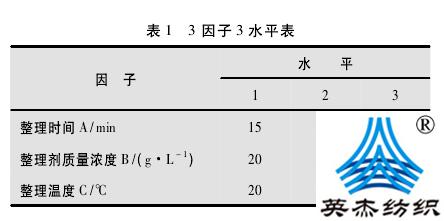 1.3復(fù)合整理方法采用兩浴浸漬法對試驗用針織物依次進行抗菌和防紫外整理??咕砉に嚾鐖D1所示。防紫外整理工藝:加入防紫外劑,在一定整理劑質(zhì)量濃度、整理時間和整理溫度下浸漬后,脫水烘干。為探討基于抗菌整理工藝的防紫外整理工藝對整理效果的影響,以整理時間A(min)、整理劑質(zhì)量濃度B(g/L)和整理溫度C(℃)為3個主要因素,進行3因子3水平正交試驗,優(yōu)選防紫外功能整理工藝參數(shù),因子水平如表1所示。2性能指標和測試方法經(jīng)防紫外線單因子試驗分析可知,防紫外整理工藝對織物的防82紫外線性能、透氣性能和懸垂性能影響較大,因此選取紫外線防護系數(shù)(UPF)值、透氣率和懸垂系數(shù)這3項指標進行試驗比較。
