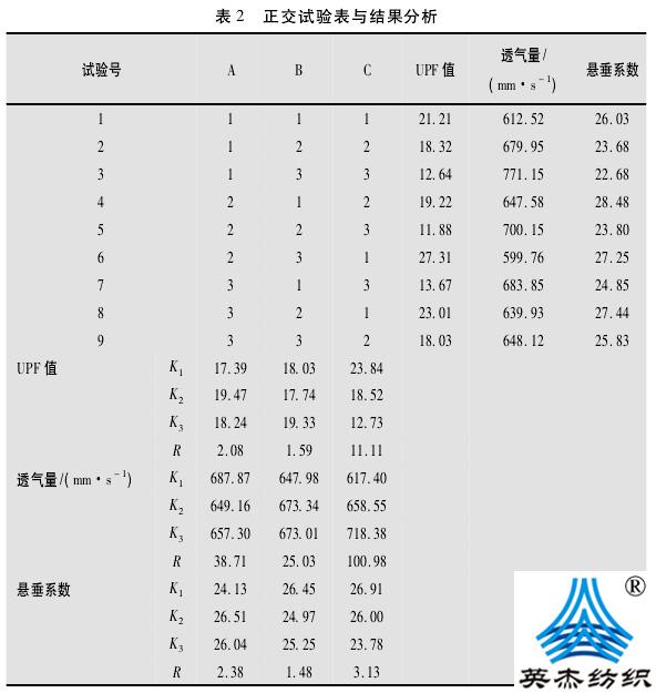 2.3懸垂系數(shù)采用XDP-1型織物懸垂性能測試儀,參照FZ/T01045—1996,測試織物(直徑為24cm的圓形試樣)的懸垂系數(shù)。懸垂系數(shù)小,說明織物柔順,即懸垂性能好;懸垂系數(shù)大,說明織物硬挺,即懸垂性能差。2.4抗菌性能參照FZ/T73023—2006,由CTTC對織物試樣進行AAA級(即經(jīng)50次洗滌后)抗菌性能測試與評價,其中菌種的參照標準為ATCC6538(金黃色葡萄球菌)、ATCC8099(大腸埃希菌)和ATCC10231(白色念珠菌)。3試驗結(jié)果與分析整理劑質(zhì)量濃度A、整理時間B和整理溫度C與紫外線防護系數(shù)UPF值、透氣量(mm/s)及懸垂系數(shù)之間的關(guān)系的正交試驗結(jié)果及分析如表2所示。