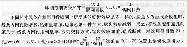 答 鎳網(wǎng)目數(shù)的選擇對(duì)印制效果有肯定的影響。一般鎳網(wǎng)目數(shù)的高低是根據(jù)花型精細(xì)程度來(lái)決策的,對(duì)塊面花型主要依據(jù)是使用本色棉布、采納工藝、保證印制均勻度。對(duì)于線條、點(diǎn)子等精細(xì)花紋鎳網(wǎng)目數(shù)的選用依據(jù),是保證在各方向連續(xù)不斷線的細(xì)尺寸應(yīng)是孔間距乘以系數(shù)1.65,即印制細(xì)線條和鎳網(wǎng)目數(shù)的關(guān)系為: