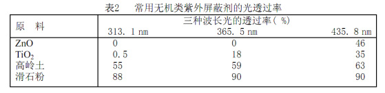 紫外線(xiàn)屏蔽劑大多是金屬氧化物或陶瓷粉末,如二氧化鈦、氧化鋅、滑石粉、陶土、碳酸鈣等 。它們都具有較高的折射率,加入織物中,可增加織物表面對(duì)紫外線(xiàn)的反射和散射。由于無(wú)機(jī)類(lèi)紫外阻擋劑的高效性、安全性、持久性,用于纖維時(shí)也不會(huì)影響織物的風(fēng)格,因而越來(lái)越受到人們的重視。[1-3]其中二氧化鈦,氧化鋅的紫外線(xiàn)透射率較低,較為常用。