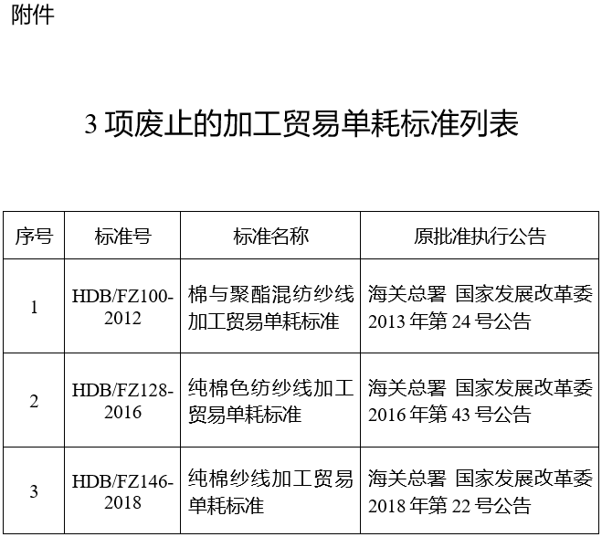 自2021年2月4日起,《棉與聚酯混紡紗線加工貿(mào)易單耗標(biāo)準(zhǔn)》(標(biāo)準(zhǔn)號:HDB/FZ100-2012)等3項加工貿(mào)易單耗標(biāo)準(zhǔn)(標(biāo)準(zhǔn)名稱見附件)予以廢止。